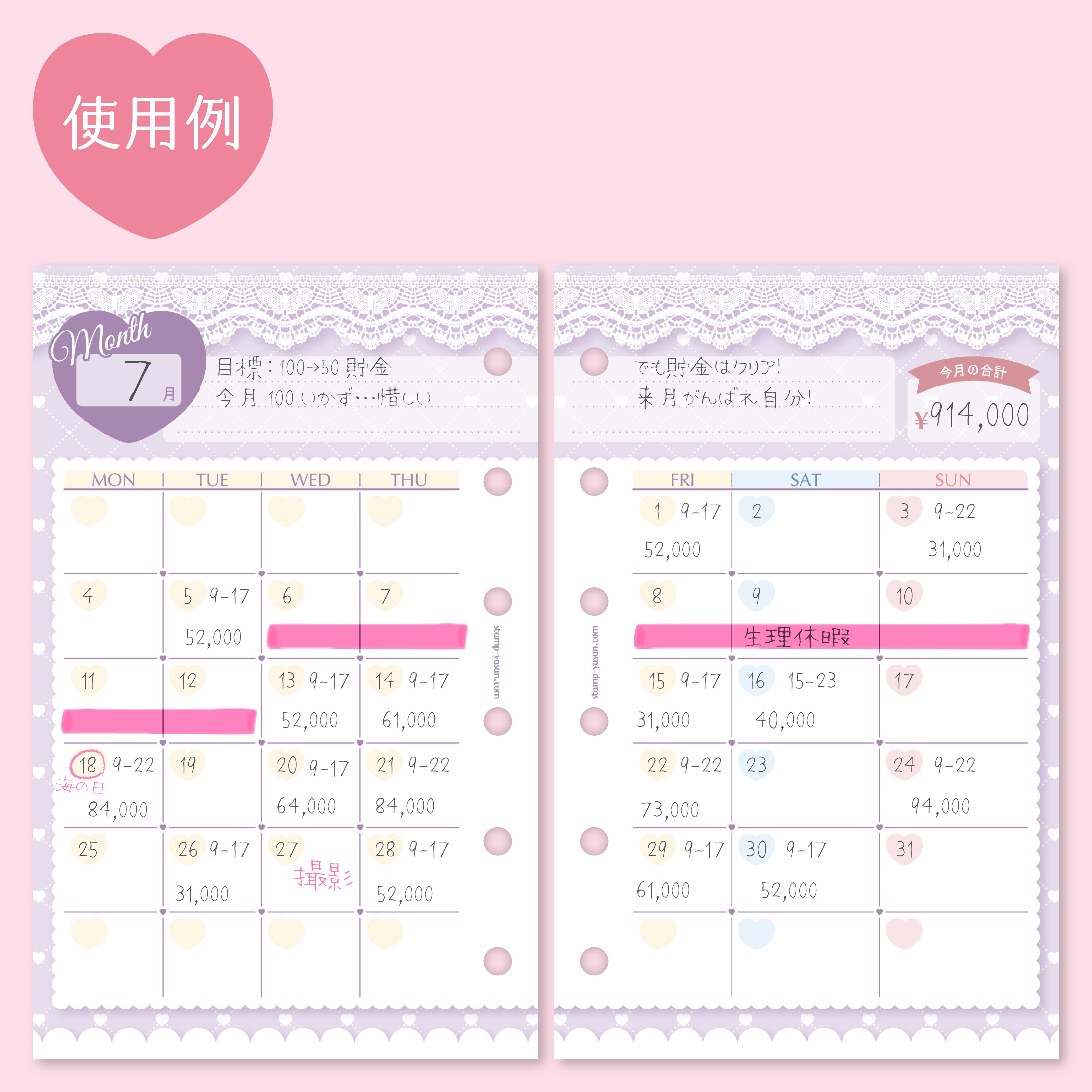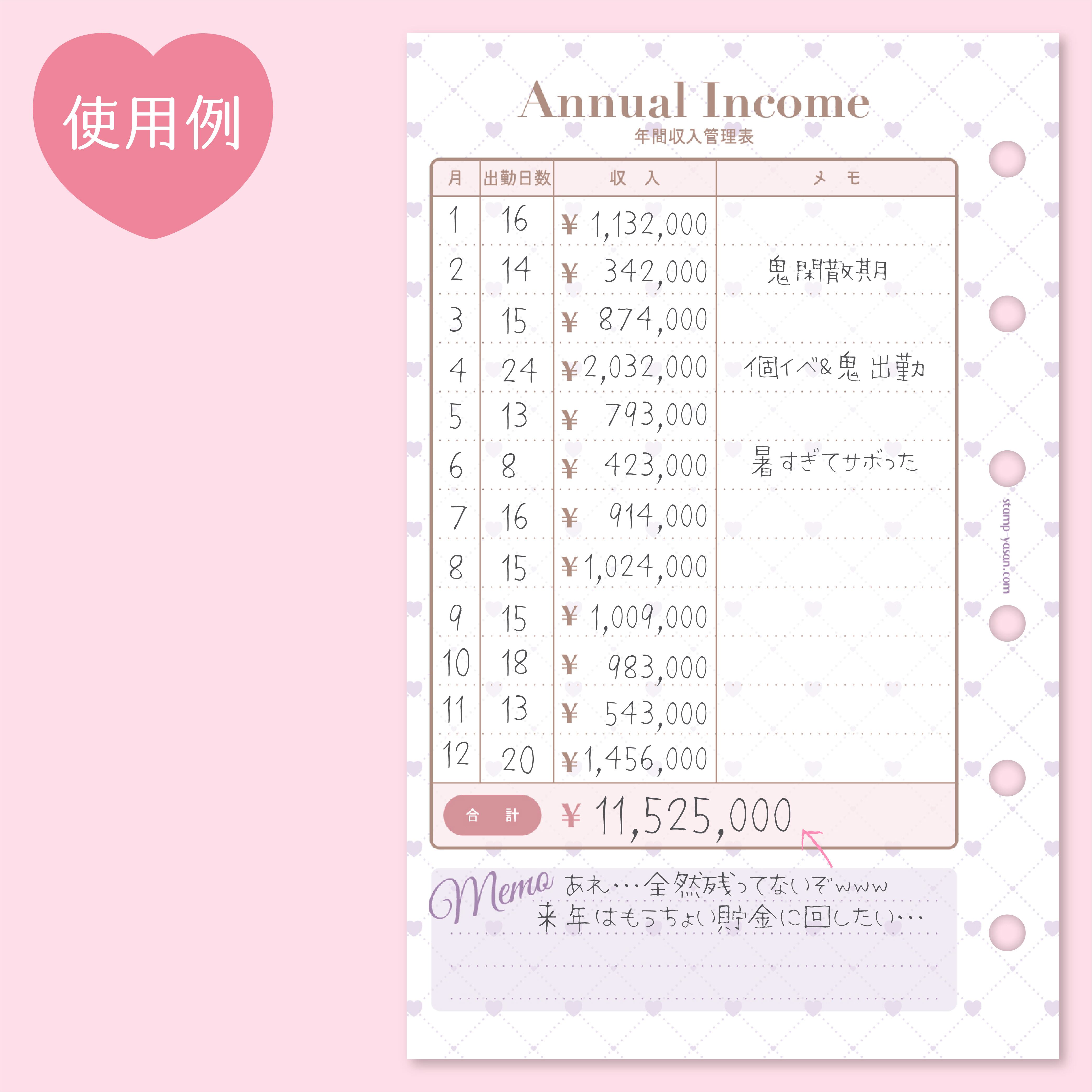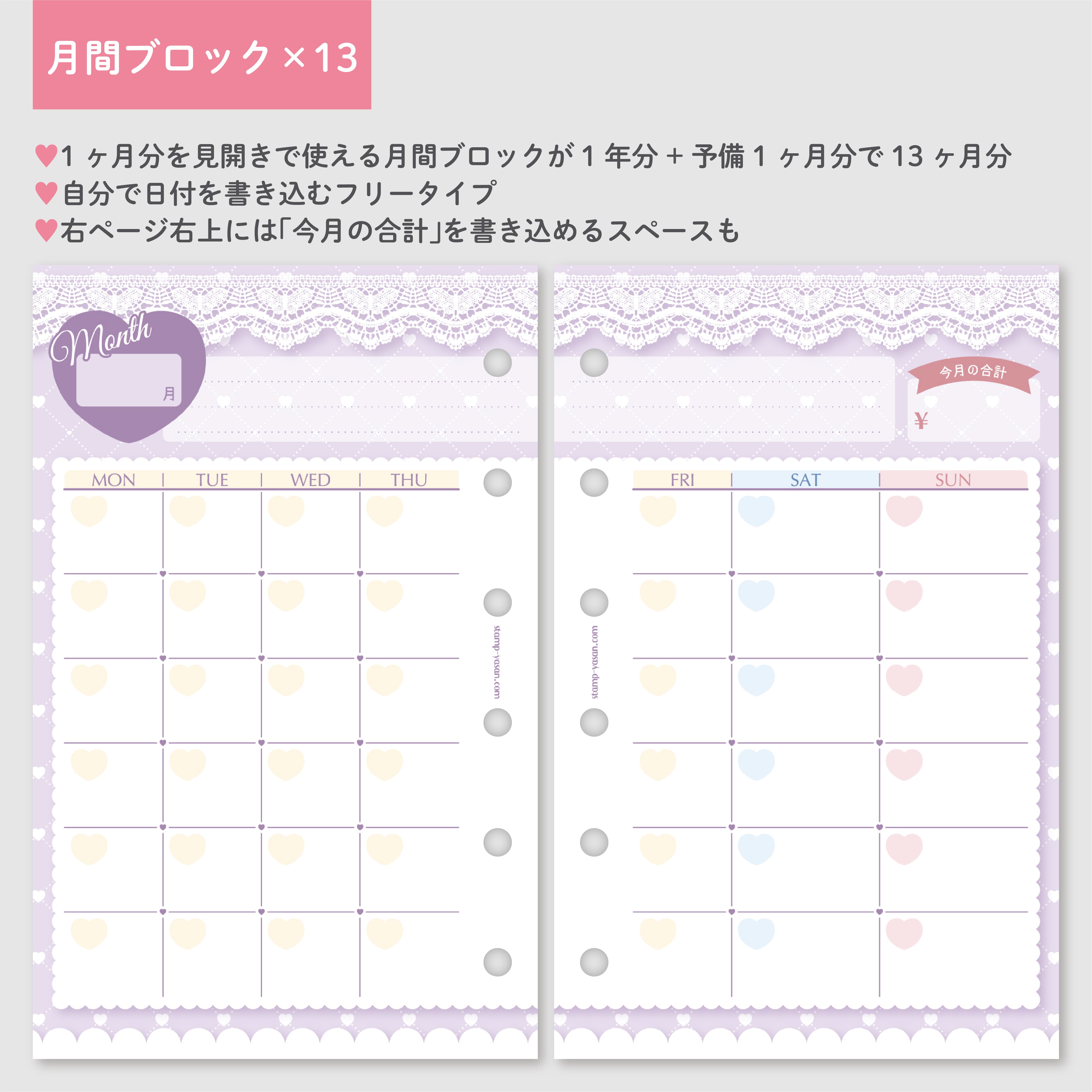♡セット内容:表紙×1、月間ブロック×12ヶ月分+予備1ヶ月分、年間収入管理表×1