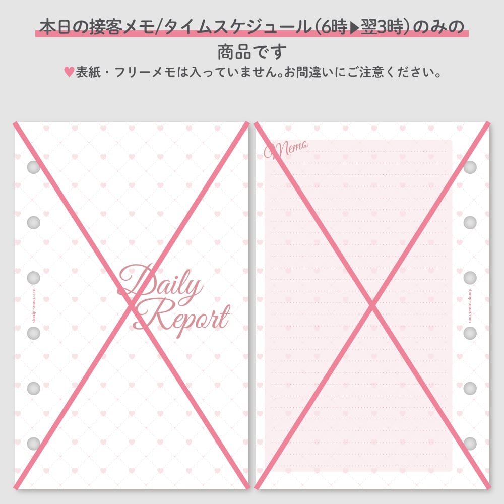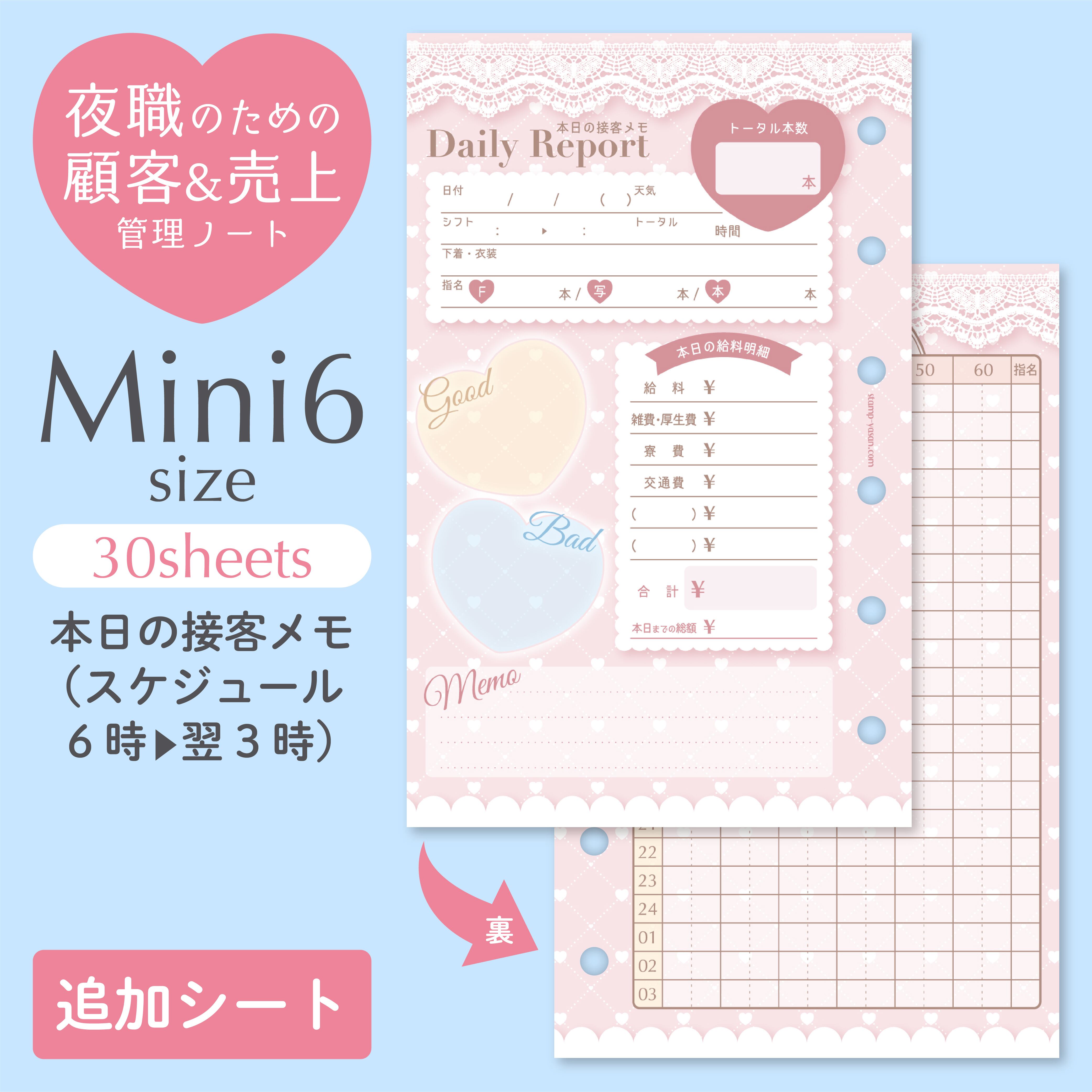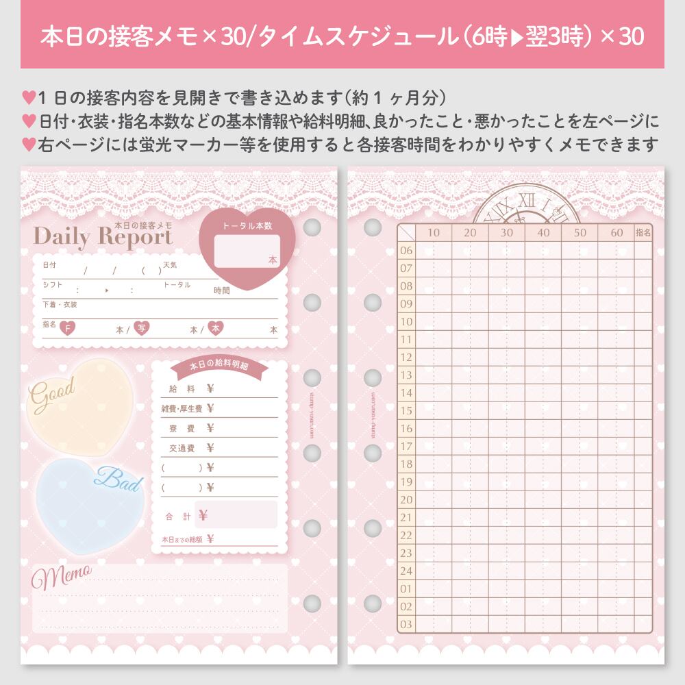 ♡セット内容:本日の接客メモ×30、タイムスケジュール(6時▶翌3時)×30