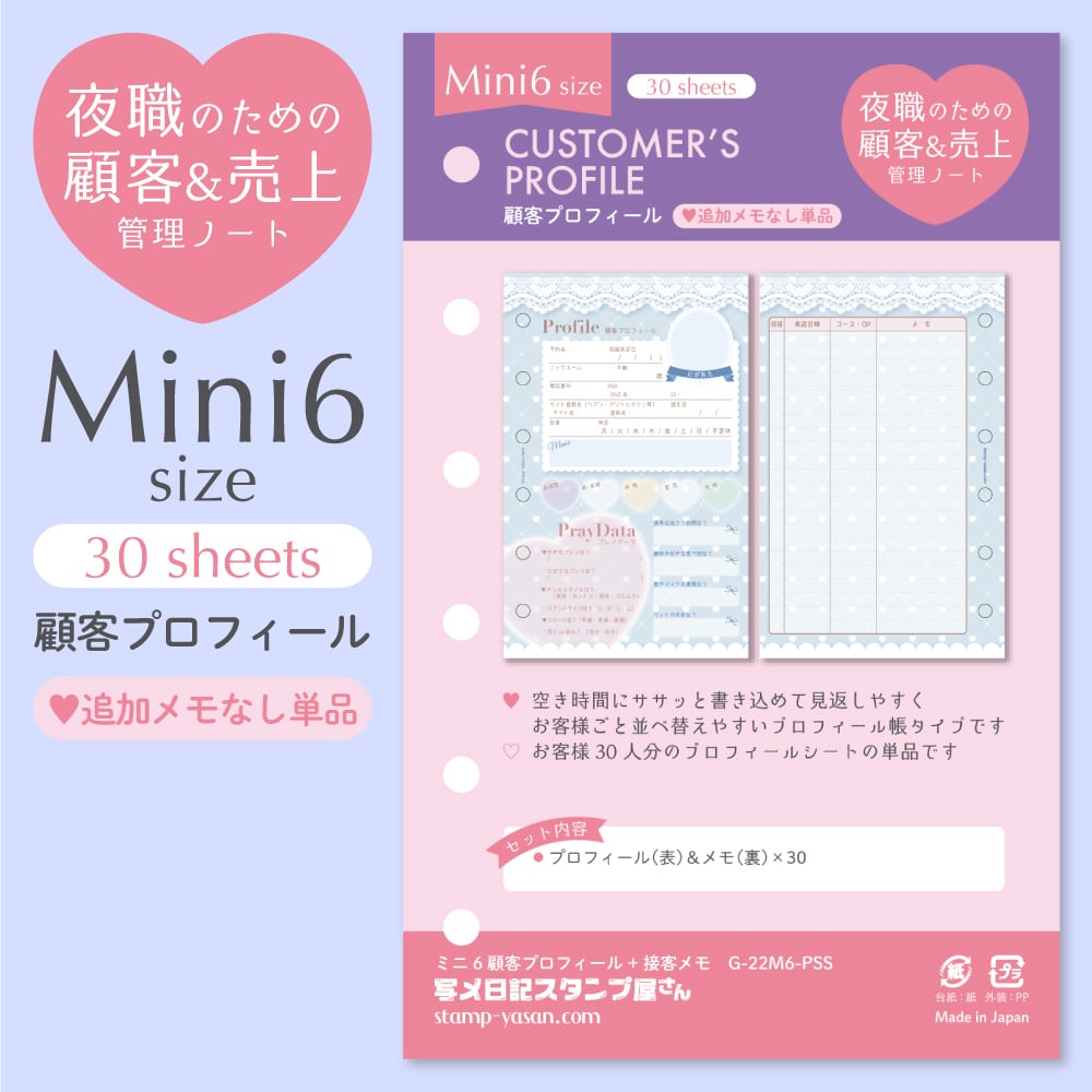 空き時間にササッと書き込めて見返しやすく、あいうえお順や来店頻度などでお客様ごとに並べ替えやすいプロフィール帳タイプの「ミニ6 顧客プロフィール+接客メモ」の単品セットです。